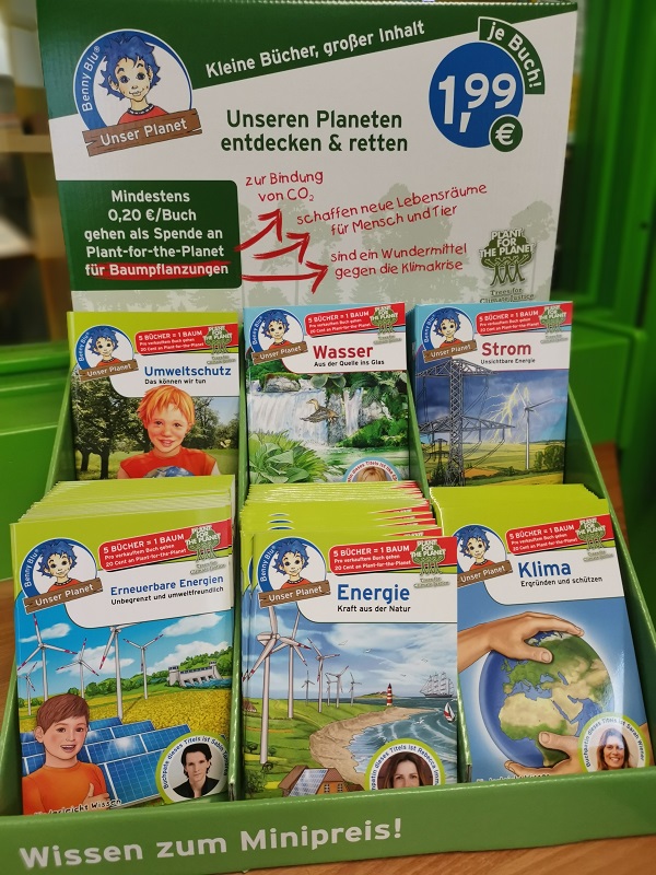 Die Kinderbücher mit Benny Blue werden zu verschiedenen Themengebieten angeboten. Die Ausgaben Benny Blue "Unser Planet" unterstützen die Initiative Plant for the Planet. Pro verkauftem Buch gehen 20 Cent an die Kinder- und Jugendinitiative, die das Ziel verfolgt, so viele Bäume wie möglich zu pflanzen. Mit prominenter Unterstützung macht sich der blauhaarige Schlaukopf stark für den Klimaschutz. Kindgerecht, kompakt und in kurzen Sätzen erklärt Benny Blue u.a. Wissenswertes zu den Themen Wasser, Wald, Bienen, Umweltschutz, Strom, Erneuerbare Energien und Klima. Die Bücher sind ab sofort im Liz erhältlich!