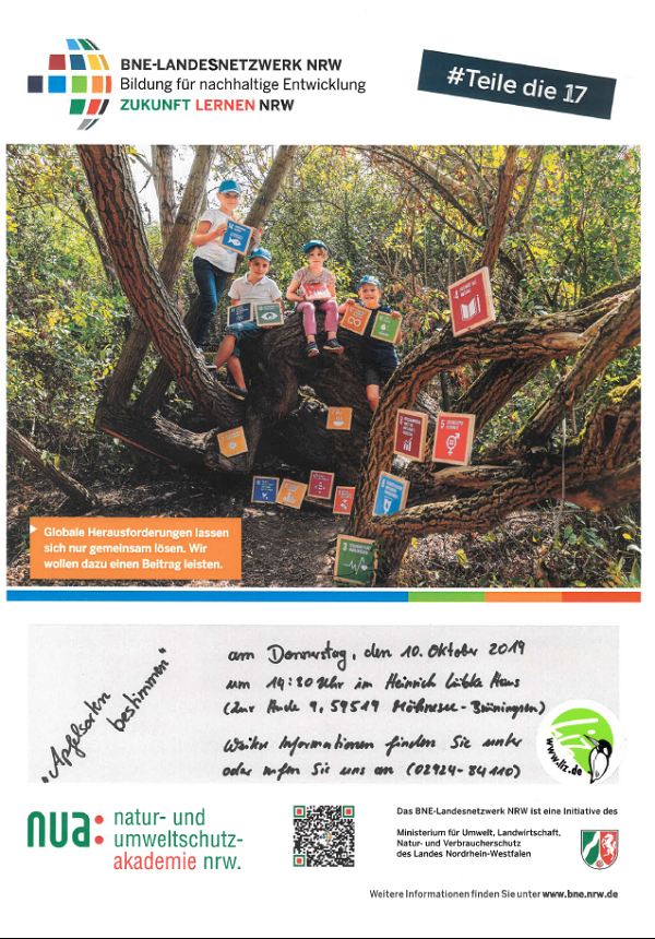 Vom 27.09. bis 16.10. finden die BNE-Aktionstage in NRW statt. In diesem Zeitraum bieten BNE-Regionalzentren und weitere Akteur*innen verschiedene Veranstaltungen an, bei denen es um das Thema Nachhaltigkeit geht. Unter dem Motto "Globale Herausforderungen lassen sich nur gemeinsam lösen: Wir wollen dazu einen Beitrag leisten", werden auch die Nachhaltigkeitsziele der Agenda 2030 in den Blick genommen. Das Liz bietet die Veranstaltung "Apfelsorten bestimmen", in Kooperation mit dem Heinrich Lübke Haus, an.