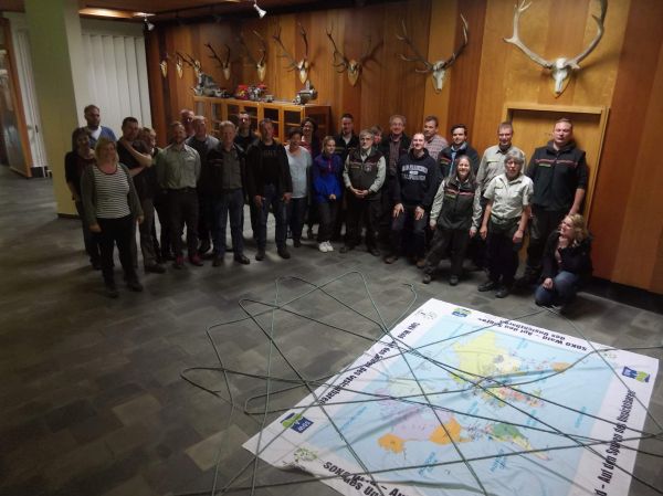 Gemeinsam mit Andrea Hirsch vom Waldmobil der Schutzgemeinschaft Deutscher Wald (SDW) und Gisela Lamkowsky von der BNE Agentur NRW bildete Liz- Leiterin Kerstin Heim- Zülsdorf die Forstamtsleiter*innen der Forstämter des Landesbetriebes Wald und Wald NRW zum Thema Wasser unter Aspekten einer Bildung für nachhaltige Entwicklung (BNE) im Jugendwalheim Obereimer fort. Nach praktischen Übungen im Wald und am Wasser mit Gewässergütebestimmung, Floßbau, Klangschale, Hängemattenentspannung oder Rollenspielstation, erfolgte am Nachmittag die ehr theoretische Auseinandersetzung mit dem Thema zur Erarbeitung von Ideen für die Umsetzung in der eigenen umweltpädagogischen Arbeit. Für ein BNE- Programm müssen mindestens zwei Dimensionen der vier Bereiche Ökologie, Ökonomie, Soziales oder Globales in einer Veranstaltung thematisiert werden. Die Teilnehmer*innen tauschten sich untereinander mit Methoden und den damit den Teilnehmer*innen vermittelten Kompetenzen aus. Das abschließende Vernetzungsspiel über der Weltkarte verdeutlichte noch einmal praktisch die globale Dimension des Themas.