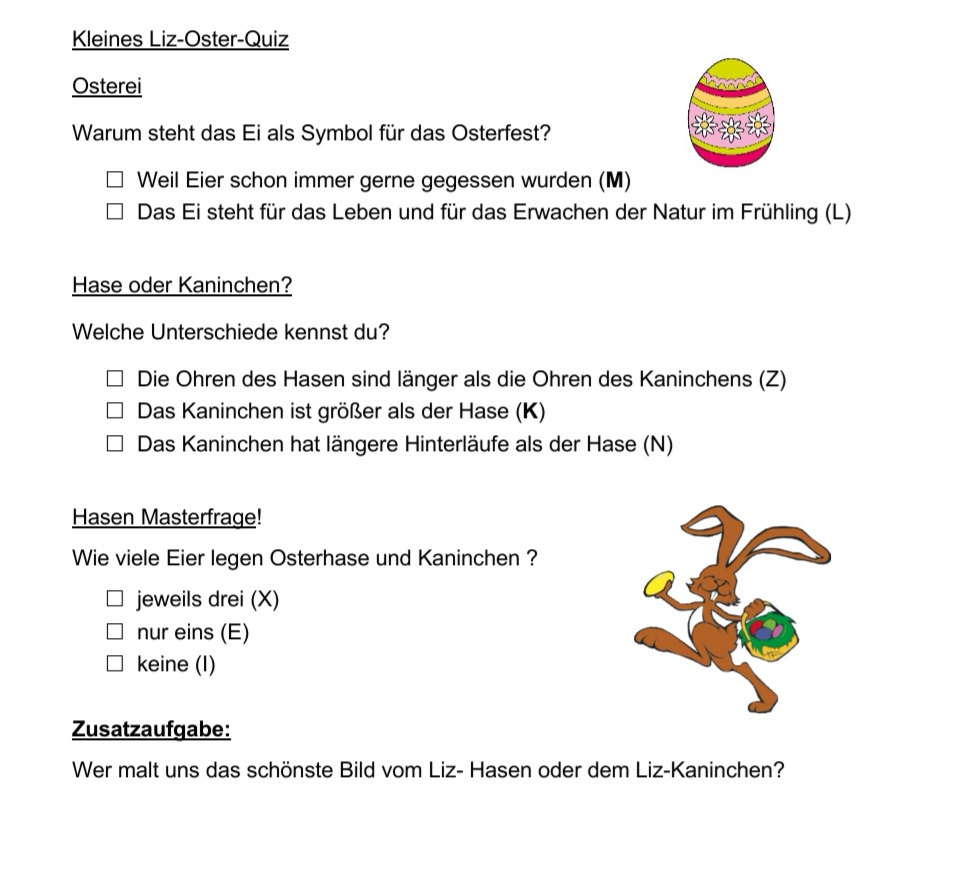Normalerweise könnt Ihr jedes Jahr an den Ostertagen das Liz bei einer tollen Osterhasenrallye erkunden. Da wir in diesem Jahr wegen Corona ja leider nicht öffnen können, hier unsere virtuellen Osterrallyefragen an Euch. Schreibt uns das richtige Lösungswort und Ihr nehmt an unsere Verlosung für ein Liz- Besuchsset teil!