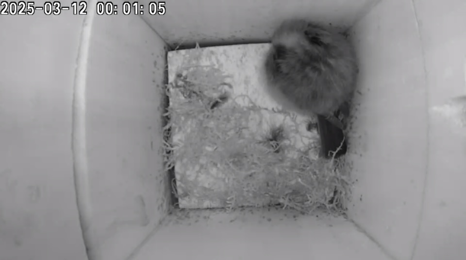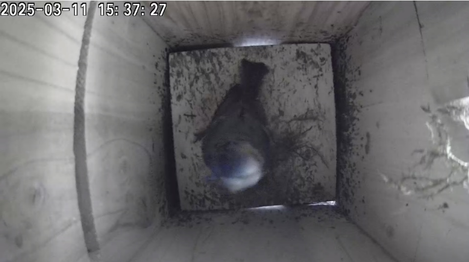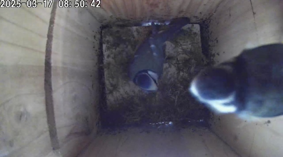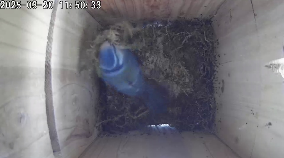 An diesem Tag trug das Weibchen zum ersten Mal Nistmaterial in den Nistkasten.