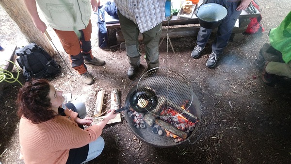 Wie BNE praktisch im Alltag von (Wald-)pädagog:innen umgesetzt werden kann, erfuhren die Teilnehmer:innen anschaulich bei einer Fortbildung mit der zertifizierten Waldpädagogin Andrea Hirsch von der Schutzgemeinschaft Deutscher Wald (SDW). Neben den Grundlagen einer Bildung für nachhaltige Entwicklung (BNE) und den Gestaltungskompetenzen wurden den Teilnehmer:innen praktische Methoden vermittelt und diese diskutiert, z.B. Holzprodukte den verschiedenen Ländern auf einer Weltkarte zuordnen und die Probleme dabei benennen. Auch wurde das Wissen im Bereich Wildkräuter bei einer Kräuterwanderung mit anschließender Verarbeitung und Zubereitung auf dem Feuer vertieft. Es gab das „Brot der Wildnis“ mit Blütenzucker, sowie Wildkräutersuppe und Wiesenbowle. Nebenbei konnten verschiedene kreative Arbeiten wie Schnitzen und Seifenherstellung ausprobiert werden.