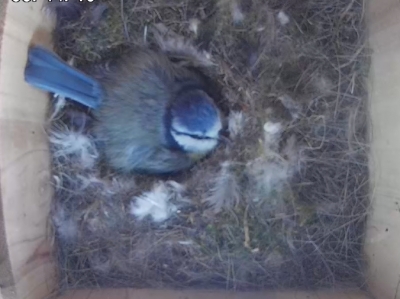 Das Blaumeisenweibchen war weiterhin sehr fleißig und hat das Nest vorbereitet, bereits Eier gelegt und mit dem Brüten begonnen.