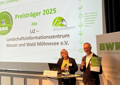 Der Umweltpreis des Jahres 2025 des Bundes der Ingenieure für Wasserwirtschaft, Abfallwirtschaft und Kulturbau, BWK, wurde dem Landschaftsinformationszentrum Wasser und Wald Möhnesee e.V. im April anlässlich des Landeskongresses des Landesverbandes NRW e.V. in Bad Sassendorf für das Gesamtvorhaben als Umweltbildungs- und Naturschutzeinrichtung verliehen.